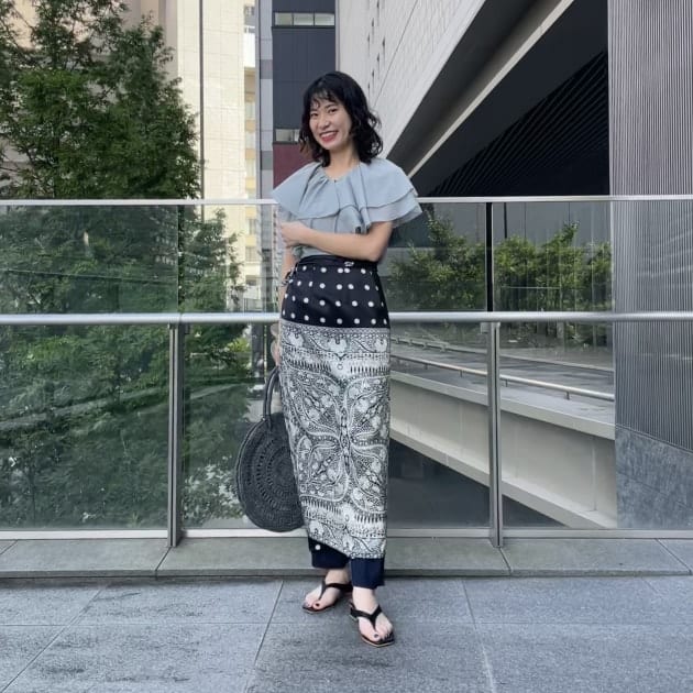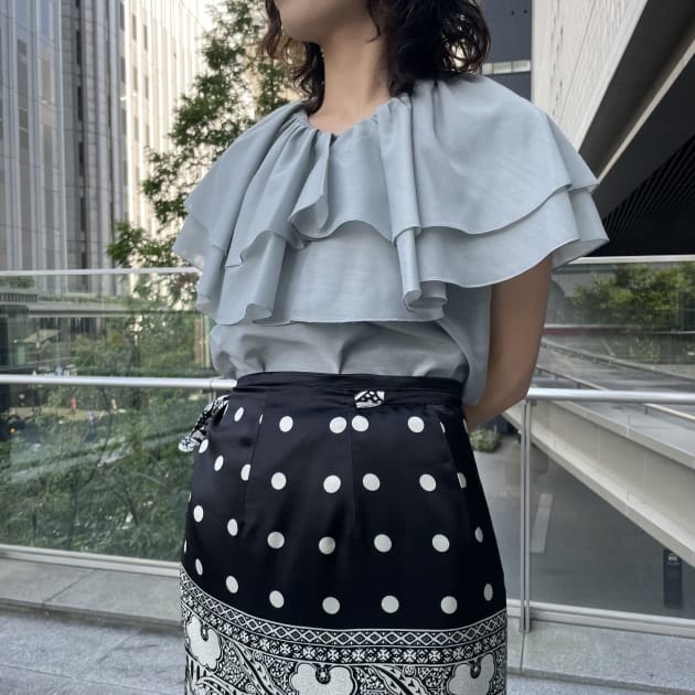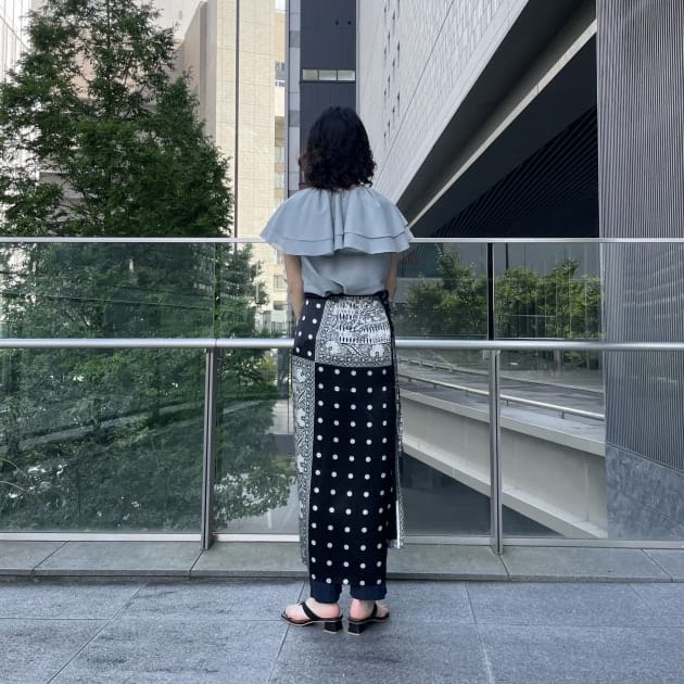 フリルシャツ、巻きスカート、のような割とアクセントになるディテールのアイテムの組み合わせですが、全然うるさくない。というかまとまりがある。なんで。色合わせ?足の爪の色とか髪型とか…洋服論を説いてもらいたい。
