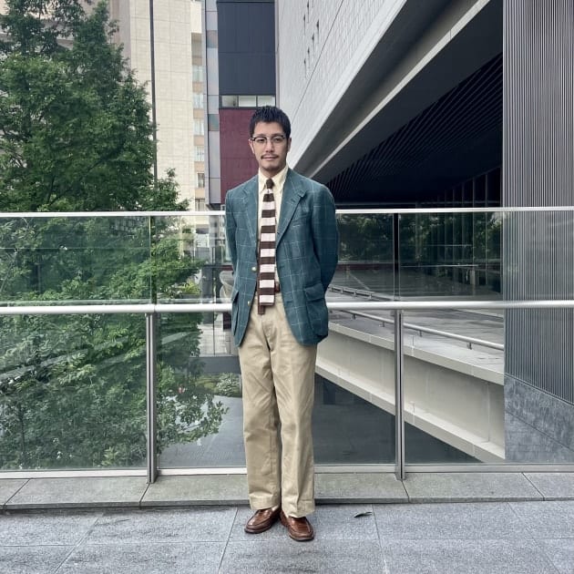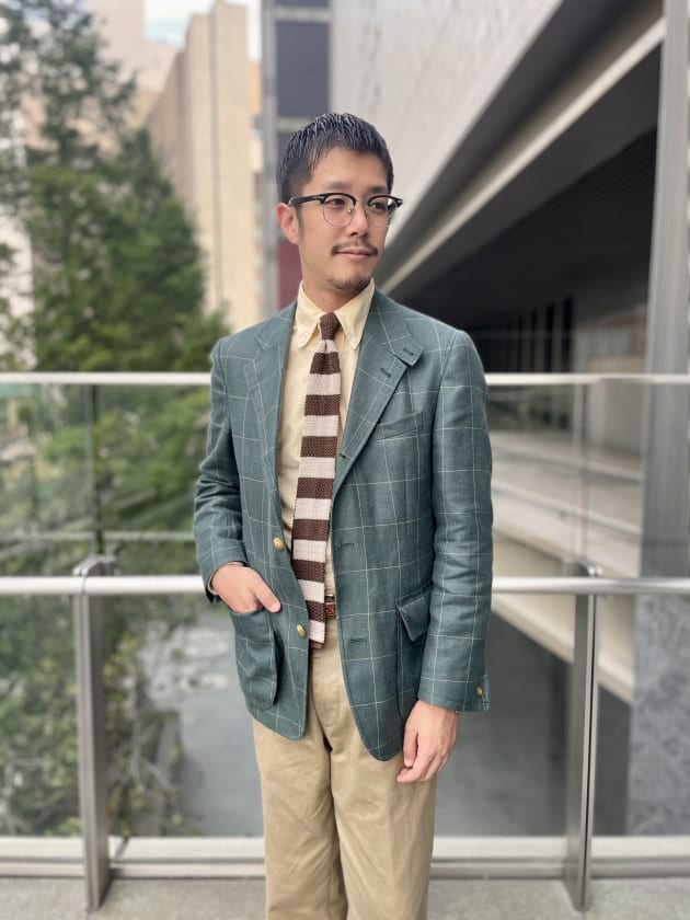 グリーンのジャケットはハンティングディテールのリネン素材。チノパン、オックスフォードのシャツ、ニットタイは王道的な組み合わせ。サマーカントリーとでも言いましょうか。