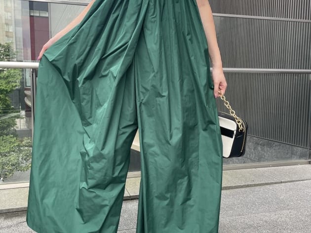 洋服の明るいグリーンと肌、髪、リップの色が上手くマッチングしていて、彼女の何時でも明るいキャラクターを表現しています。なんか眩しい。キャミみたいなワンピースみたいなサロペット?もTシャツをレイヤードしてアクィブな印象に。