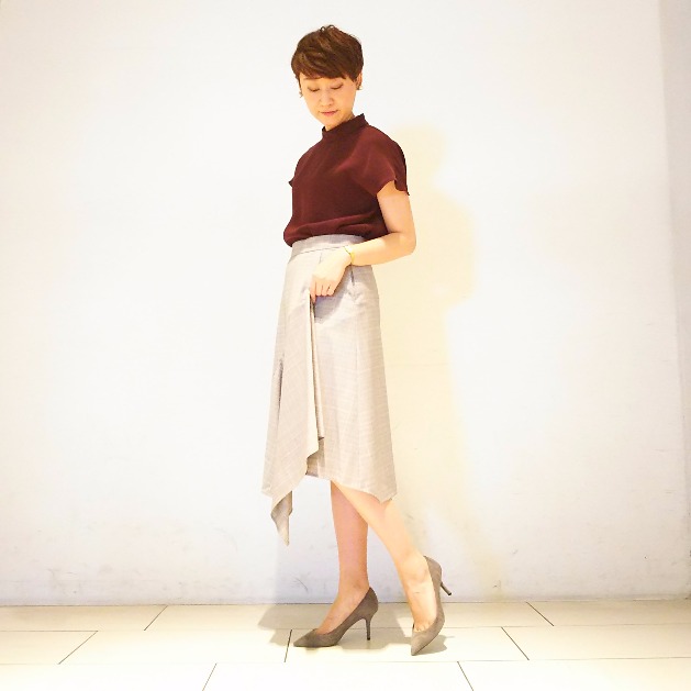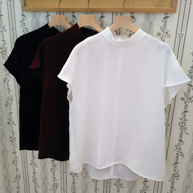 高級感の増したとろみ素材、襟元のタックをなくし、よりすっきりとした1着になっています。