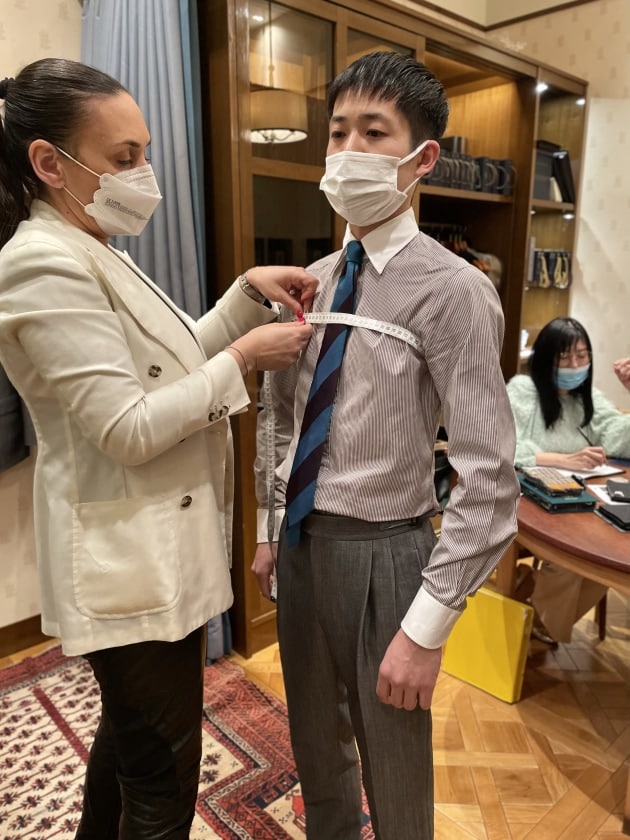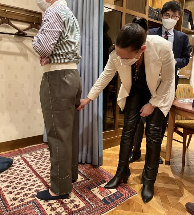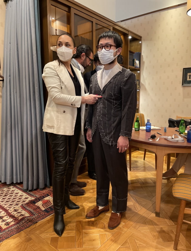 映画や人物からインスピレーションを得て拘ったディテールをオーダーしている梶谷。希望している生地が間に合わなかったので、今回は仮の生地を使用して仮縫いを。