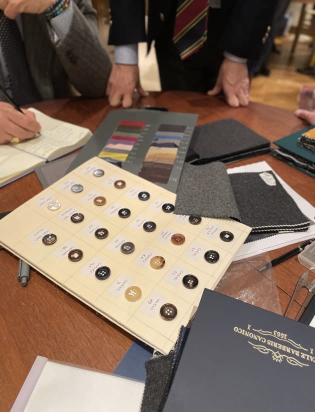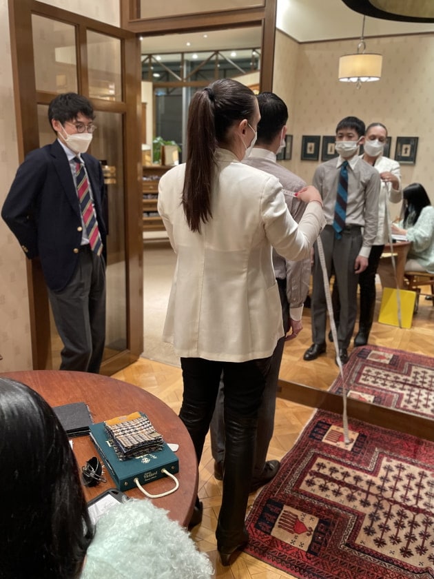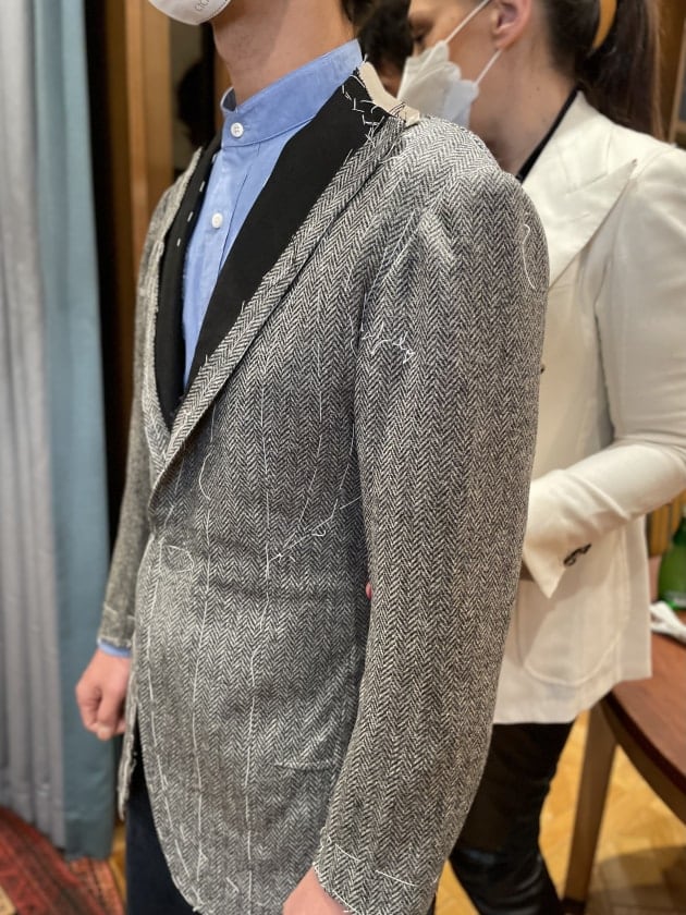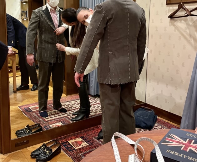年々上がる価格、そしてなんといってもこれからの人生であと何回経験できるであろうこの非日常な空間や雰囲気に誘われ、気づけばリネンの四つボタンダブルのブレザーをオーダーしていました。笑