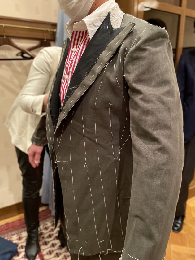 こちらのお客様は、前回にオーダーしていただいたヘヴィウェイトのコットンスーツ(グリーン色)の仮縫い中。