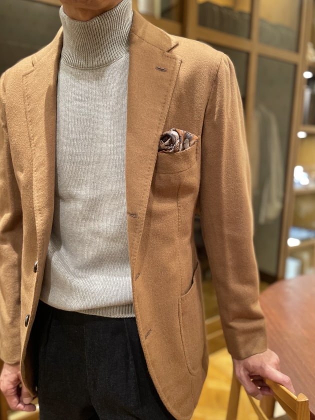 昨シーズンの〈DALCUORE(ダルクオーレ)〉のキャメルジャケットに、なんとも優しいカラーと編みの〈ROBERTO COLLINA(ロベルト コリーナ)〉のモックネックニット。