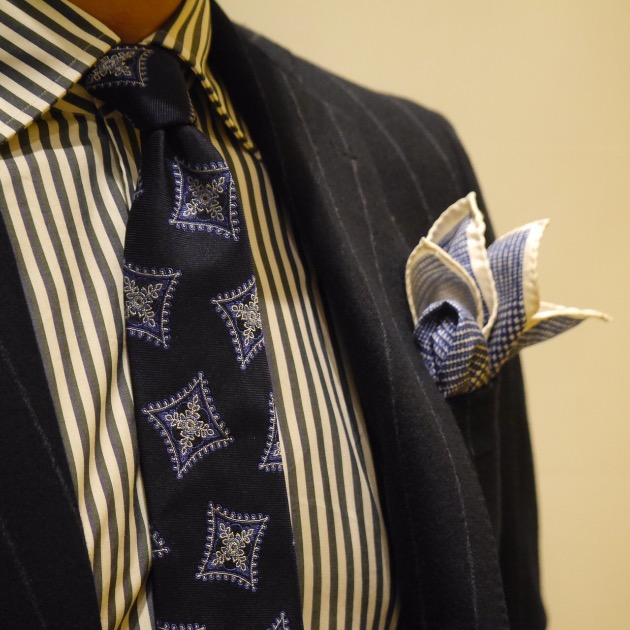 シャツのストライプのピッチを細くしたり、チーフの柄を細かくしているのも、タイの大きな柄を引き立たせています。