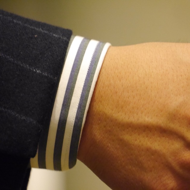 シャツのストライプに、ブルーだけでなく、グリーンの配色があって、ワンポイントになっています。