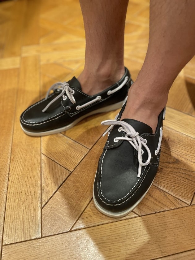 足元は軽快に〈SEBAGO(セバゴ)〉のネイビーデッキシューズ。
