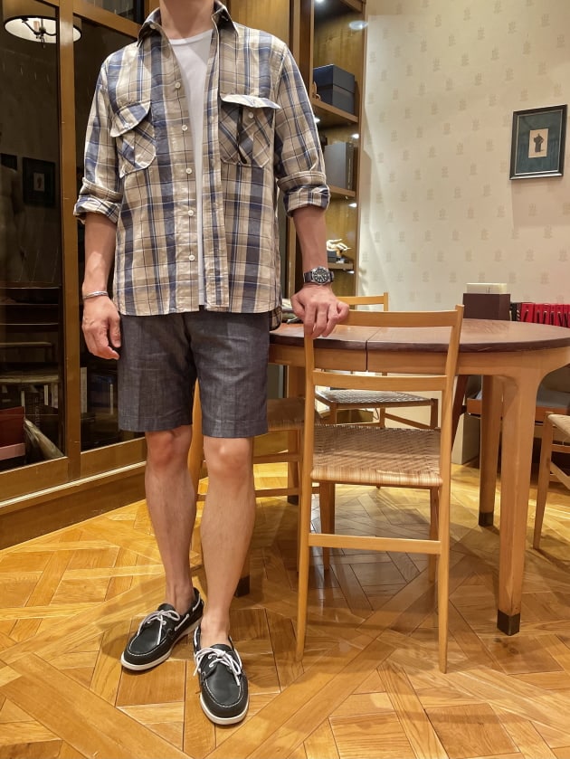 大人のショーツスタイリングのトップスはロングスリーブを腕まくりってことです。