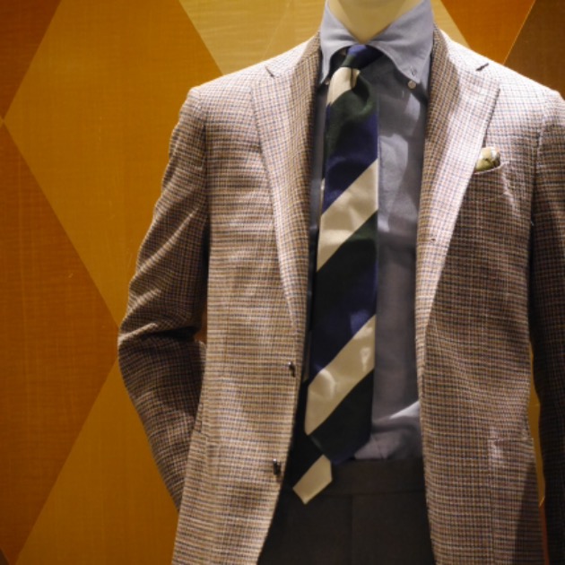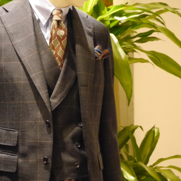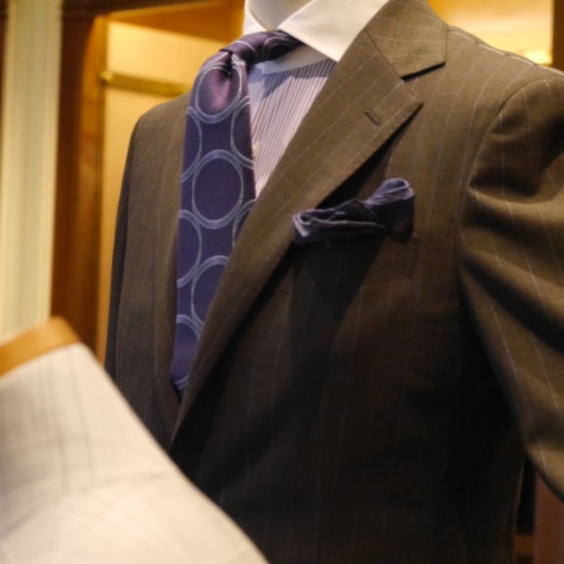 タイにチーフ、ところどころにブラウンを入れることで、非常にまとまったコーディネイトになっています。