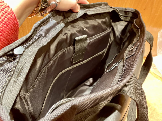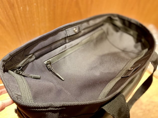荷物が多ければファスナーを閉じてボックス型で使用可能です。天マチにファスナーポケットまで付いてます!