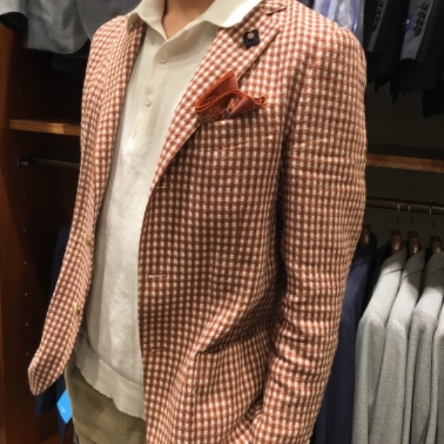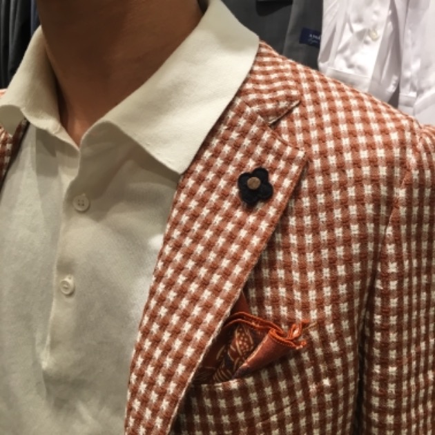 チェックジャケットにニットポロを合わせた大人の休日スタイルだそうです。