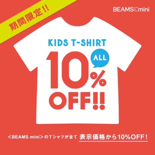 ビームス アウトレット 入間では<BEAMS mini>Tシャツ全品10%OFFキャンペーン開催中です。6/14(金)〜30(日)の期間中、<BEAMS mini>のTシャツをお買い上げいただくと、レジにて更に10%OFFとなります。