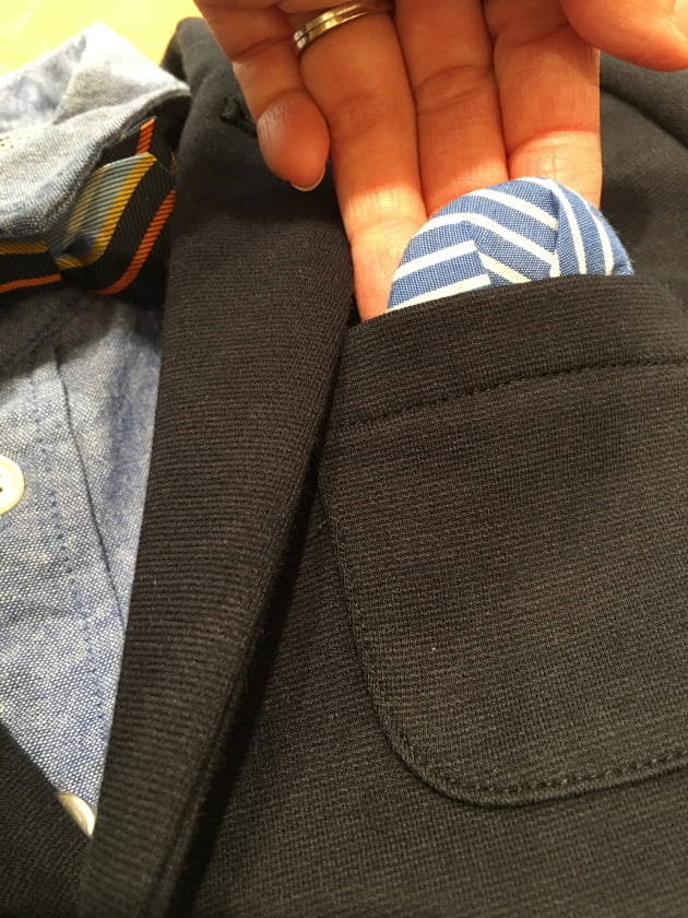 ジャケットの胸ポケットにはアクセントになるチーフもこなれた雰囲気に!