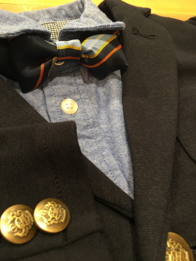 普段使いも可能なシャンブレーシャツに着脱が楽な蝶ネクタイでオシャレにキメて☆