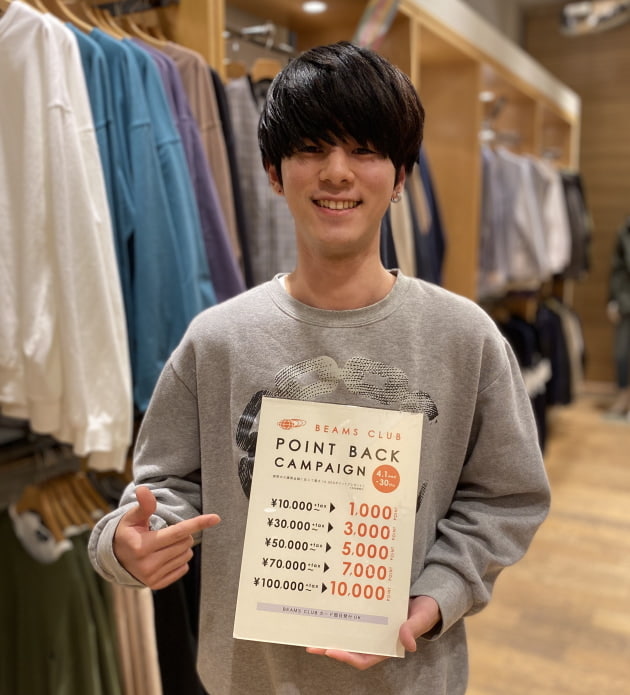 ビームス アウトレット 入間では、4月1日(水)〜4月30日(木)の期間中、BEAMS CLUB 会員様対象の「ポイントバックキャンペーン」を開催します。