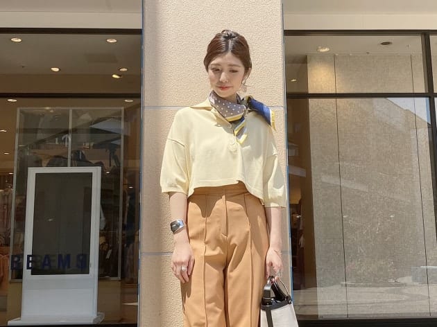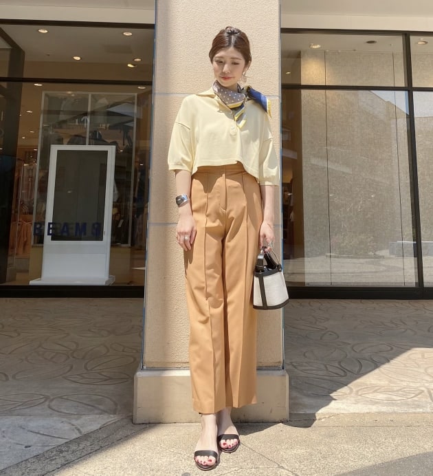 アクセントにスカーフを合わせて、スッキリした顔まわりに華やかさをプラス。