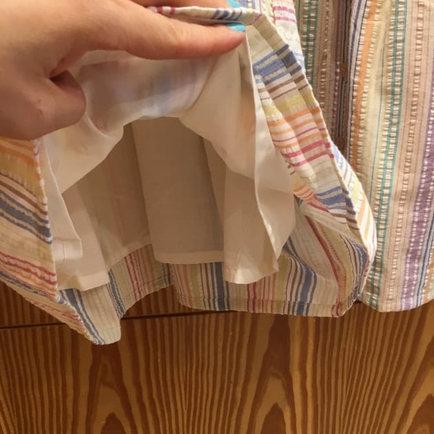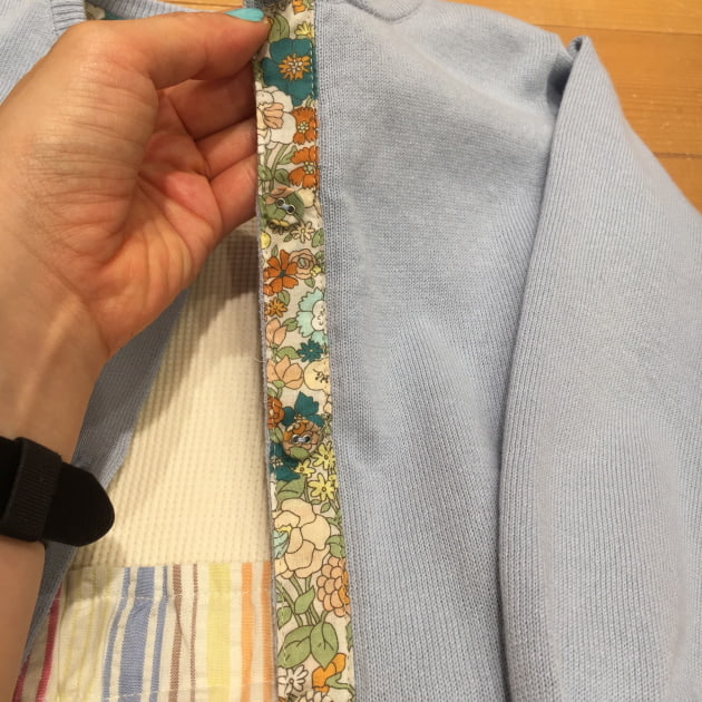 くるみボタンが付く下前立てと肩ヨーク内側に別布のコットンフラワー生地を使用し、更に女の子らしく仕上げました!
