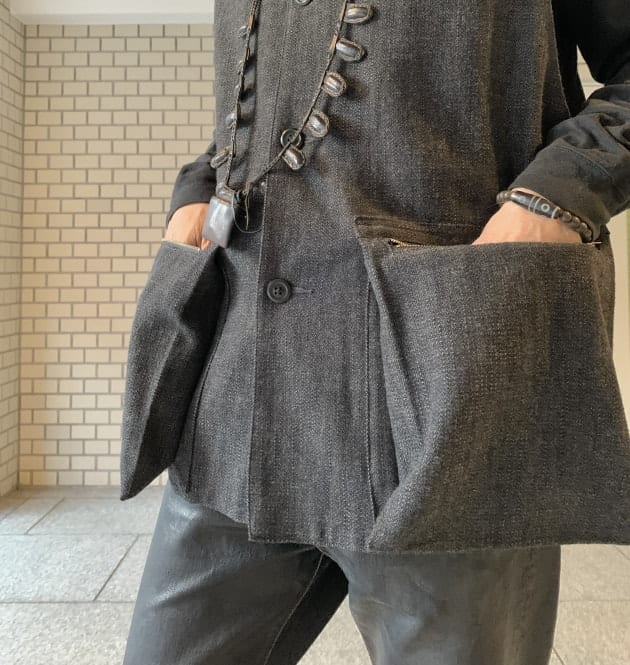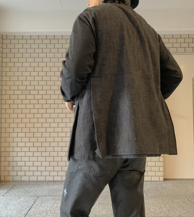 ヘリンボーン生地(表地:綿70% 毛17% ナイロン4% 裏地:綿100%)の素材を生かし、長めの着丈設定で抜群のバランスで作製されています。