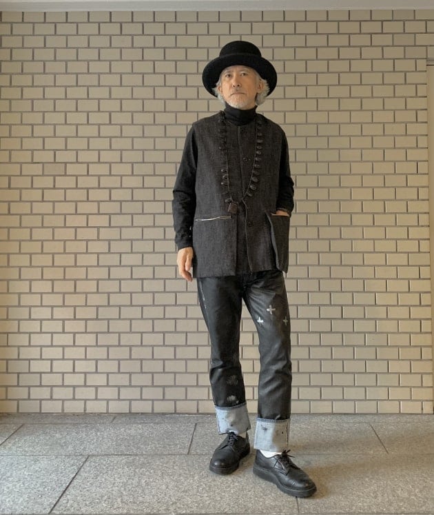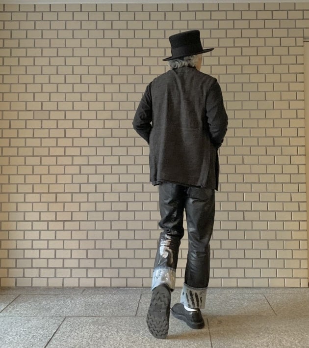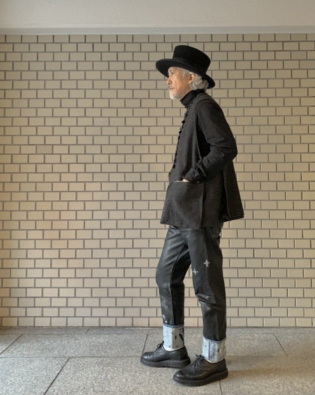シンプルにタートルネックのロングスリーブTシャツ、アクセントにシルクハットをチョイス。