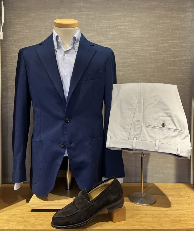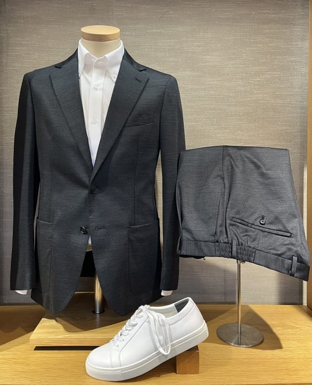 セットアップに合わせる事で堅くなり過ぎず、こなれ感のあるビジネスカジュアルスタイル。足元にはレザーシューズで上品にも、スニーカーで軽快にも。