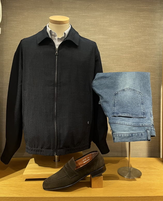 大人のカジュアルスタイル。デニムパンツにローファーで上品ながらも休日らしいアクティブなスタイル。