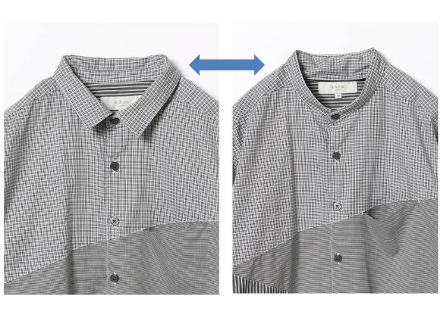通常の衿型でもある「レギュラーカラー」としても着用可能ですが、羽根衿と呼ばれる部分を内側に折り込む事でここ最近多く見られる「バンドカラー」の衿型としても着る事ができるシャツです。