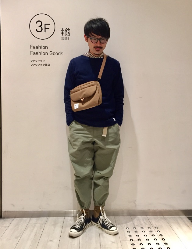 シャツ、バッグ、ソックスをブラウンで纏めました。