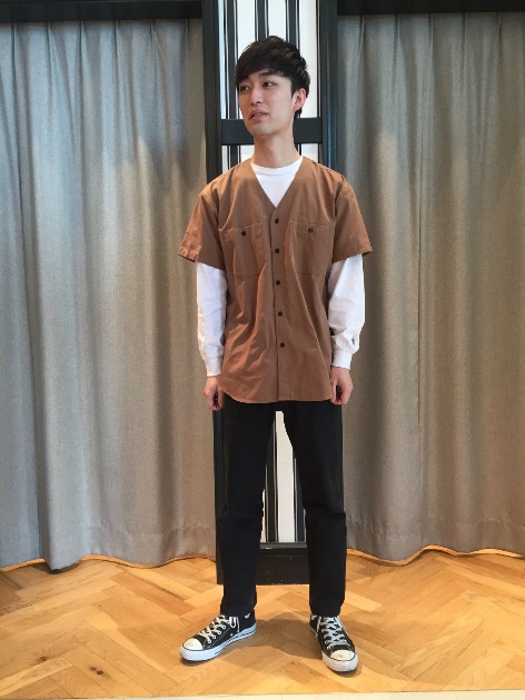 スタイリング15 藤尾 洸喜 2017.05.18 こんにちは。FUZIOです。スタッフ笹部のスタイリング。ノーカラーの半袖シャツに、ロングスリーブのクルーネックは鉄板です。ユニバーサルオーバーオールの半袖シャツ、すごい良い。では、また夜に来ます。