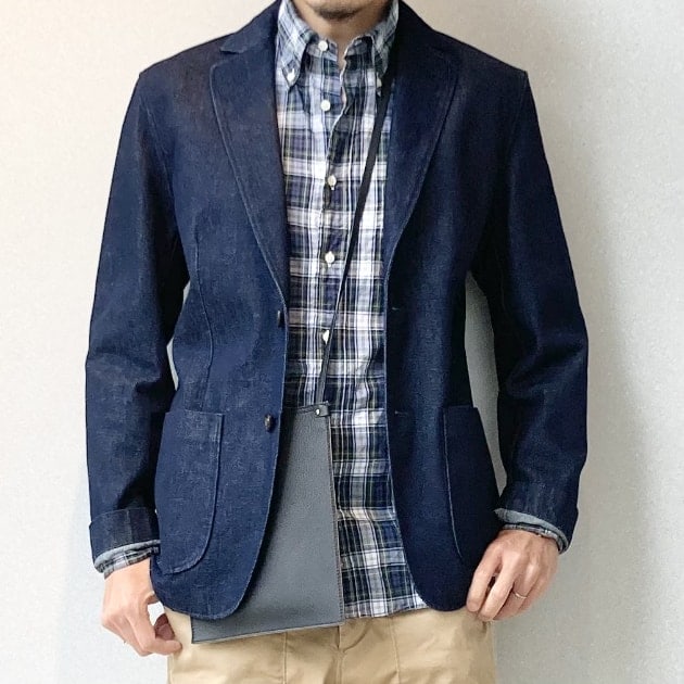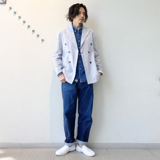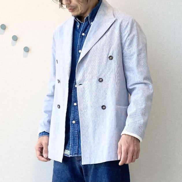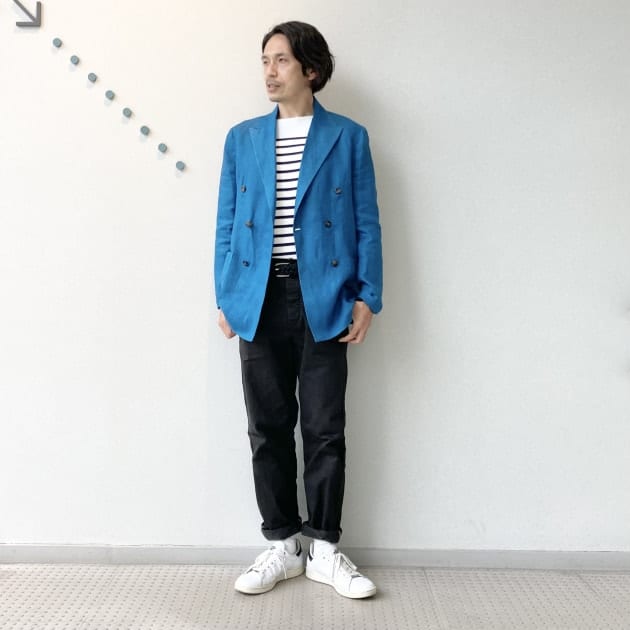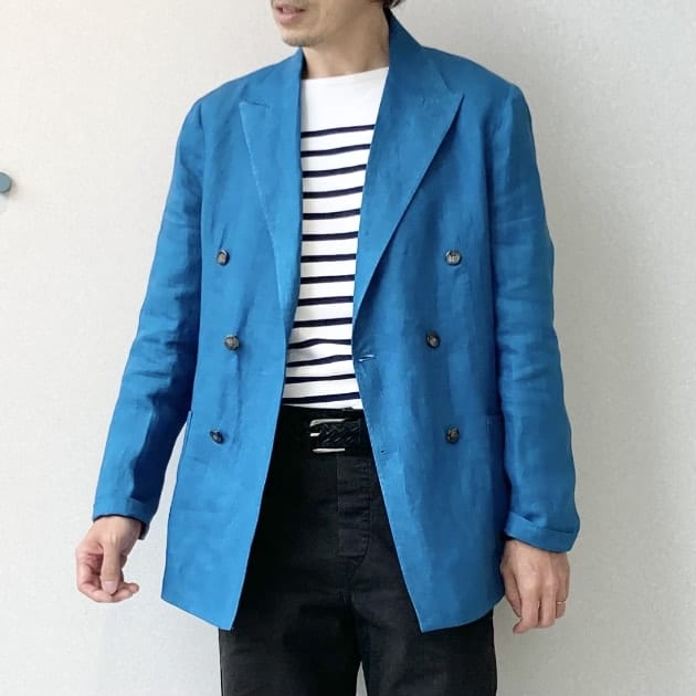 ダブルジャケットはブレザーしか持ってないな…という方へ。鮮やかブルーのリネン生地なので、あえてラフに着こなしましょう!