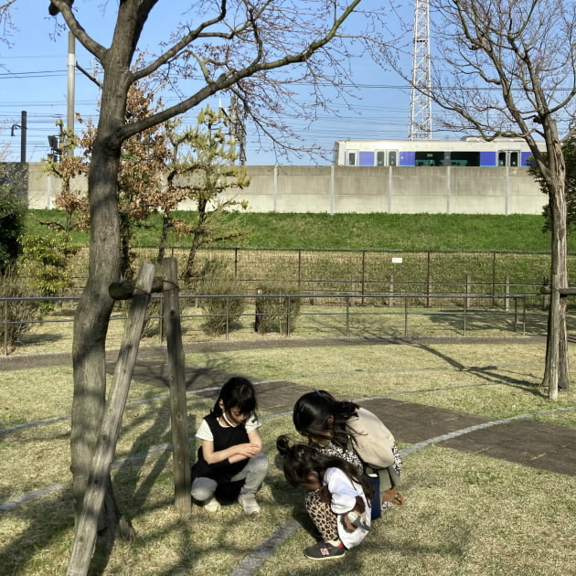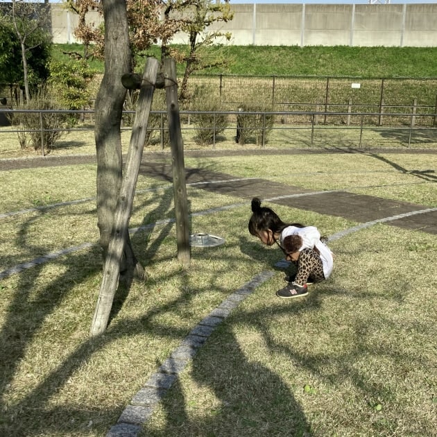 (芝生でアリさんと戯れる娘と、影で存在感を出そうとする筆者)