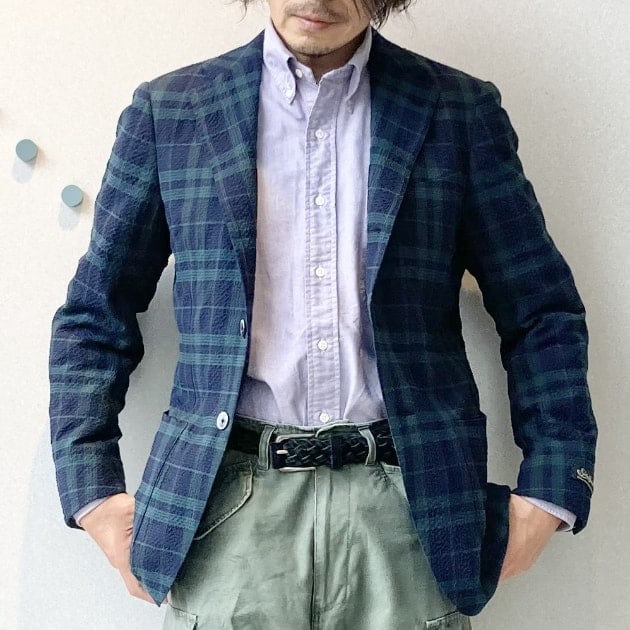 涼しげなシアサッカーの、ストライプではなくチェック柄です。落ち着いた柄なのでオンオフどちらでもキメてくれます!