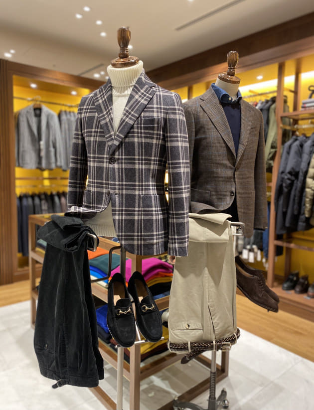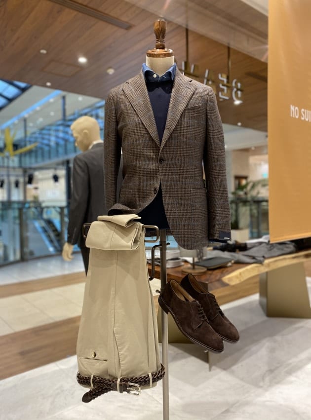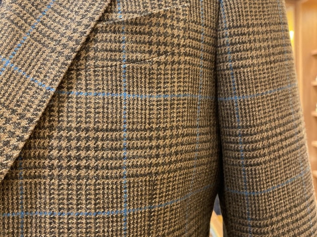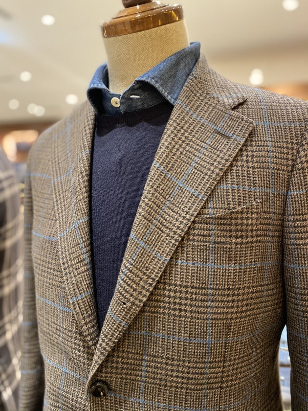 ジャケットは<LARDINI>からグレンチェック柄にブルーのペーンが目を惹くこちら。