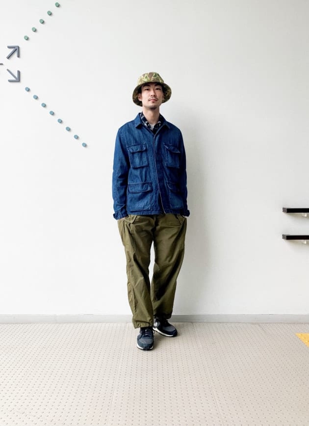 別注〈REMI RELIEF〉コットンリネンシャツジャケットをメインに、ハンターカモ柄のバケットハット、足元はNIKE デイブレイクを合わせた少年らしいスタイリングです。笑