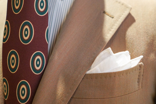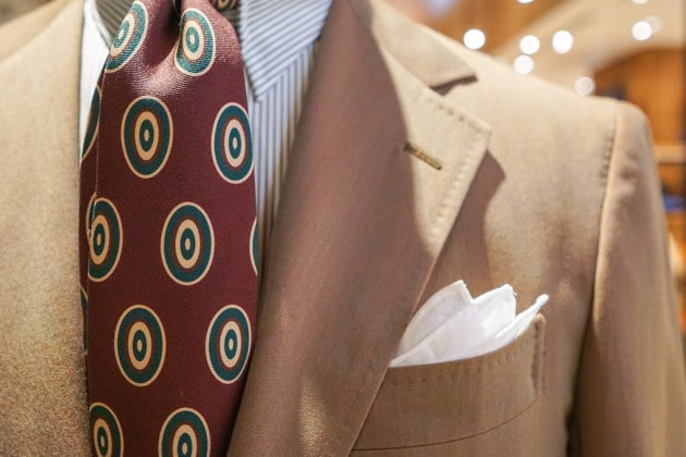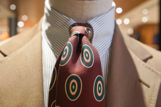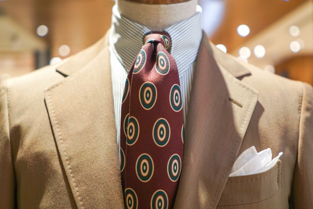 ネクタイは、ボルドー、グリーン、ベージュの印象的な色柄を用いています。