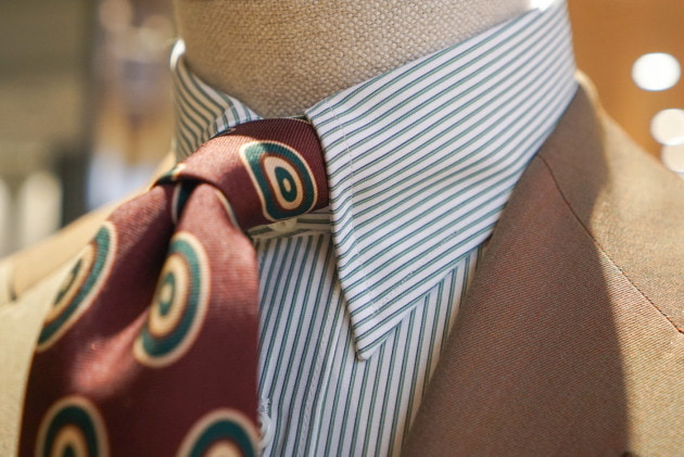 ストライプが細いピッチなので、柄の大きさを変えたネクタイと相性が良いです。