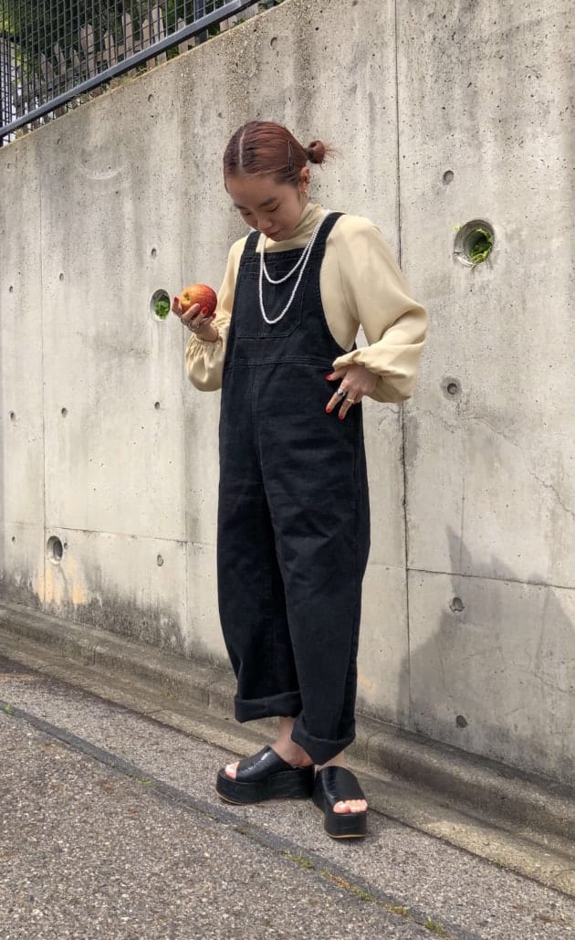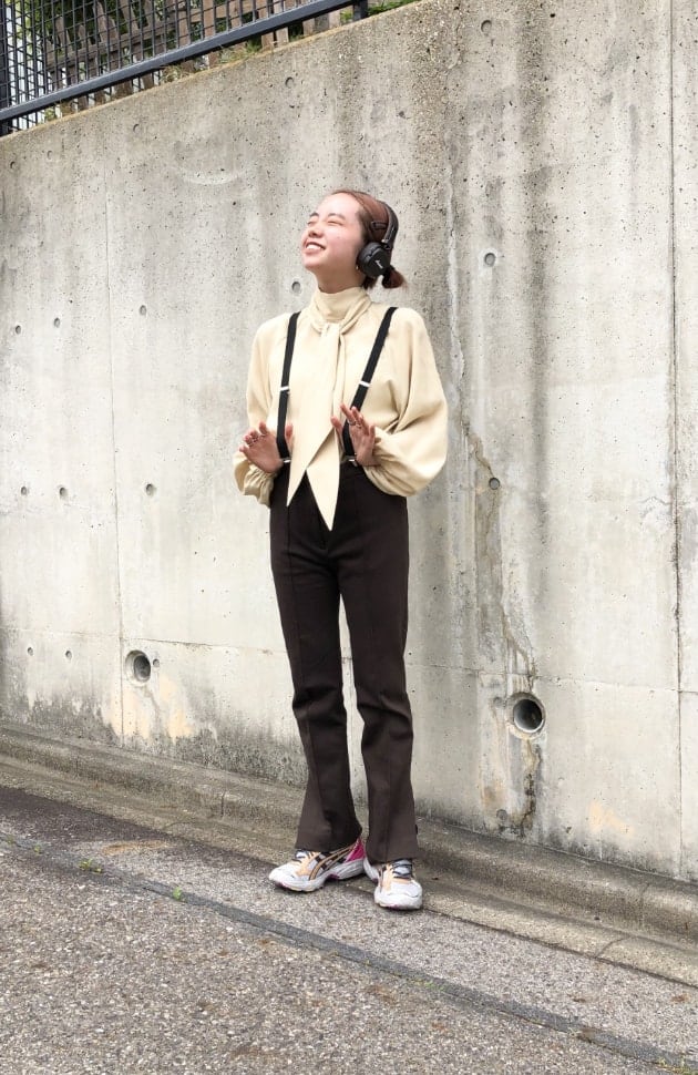 1番目のスタイリングは、同系色で合わせてサスペンダーで締めてみました!