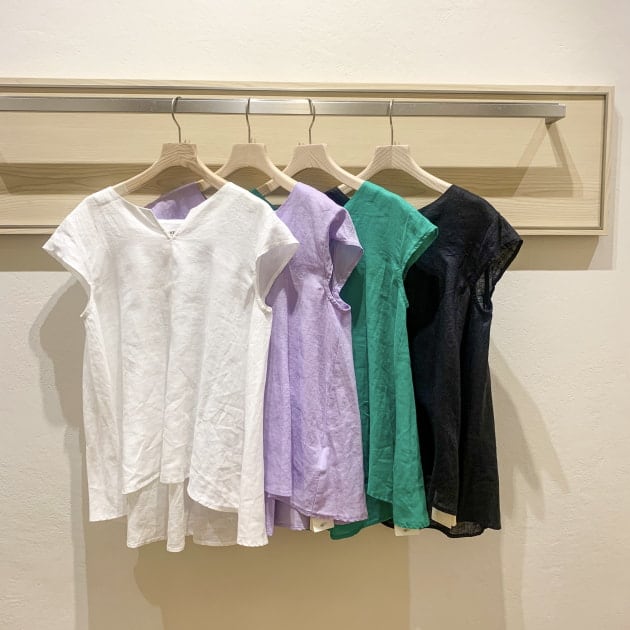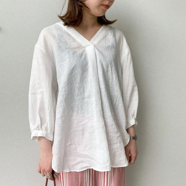 Ray BEAMSリネンキーネックフレンチスリーブシャツ