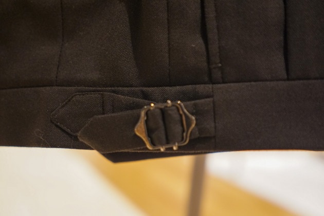 色はダークブラウン。ベルトループ無し、サイドアジャスターパンツ。