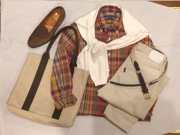 マドラスチェックシャツをロールアップし、肩からニットを掛けたアメリカンスタイル。