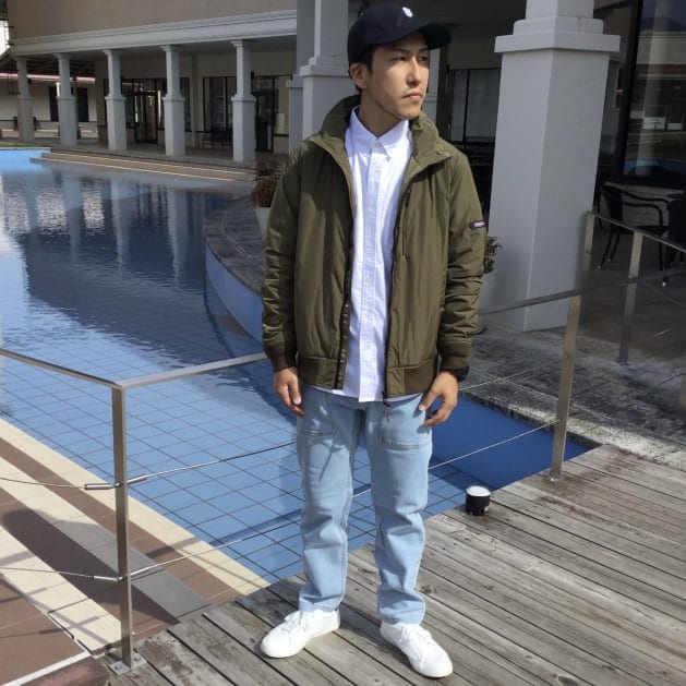 私のオススメコーディネートと致しまして、サックス系を選び、シンプルなシャツにボリュームネックMA-1で如何ですか?