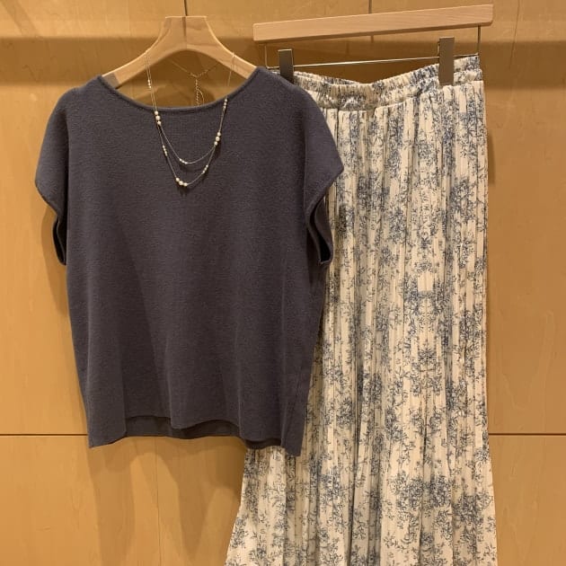 ブルーのトップスに同じくブルーの入ったスカートを合わせてみました。