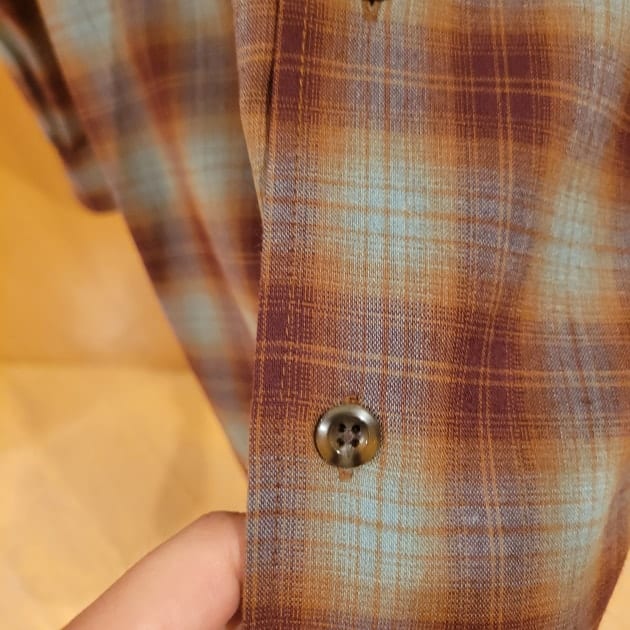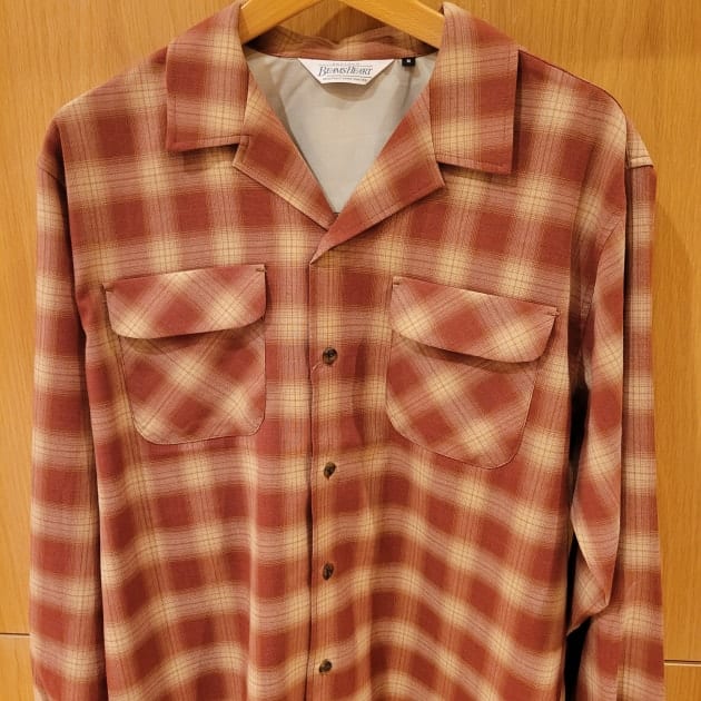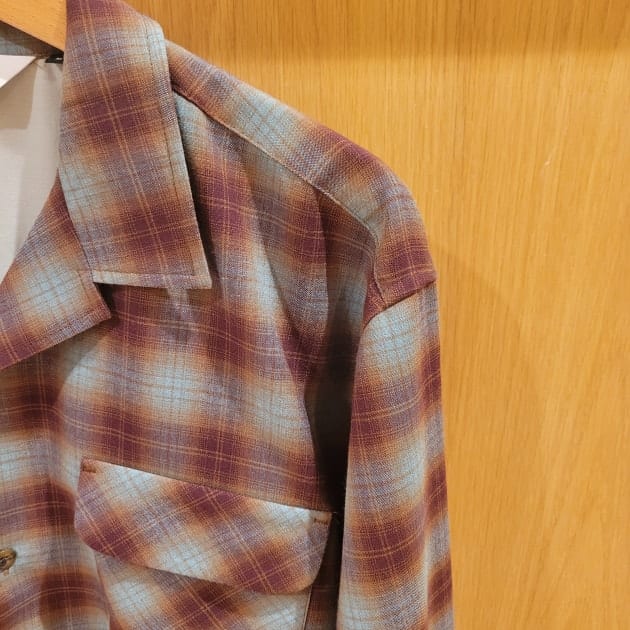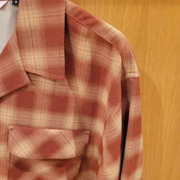 商品名通りポリエステルとレーヨンがベースで肌触りが良く、滑らかな素材です。オンブレーチェックで胸ポケットが2つ付いたオープンカラーシャツです。