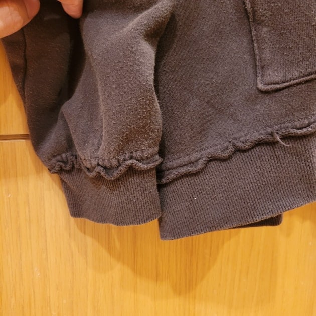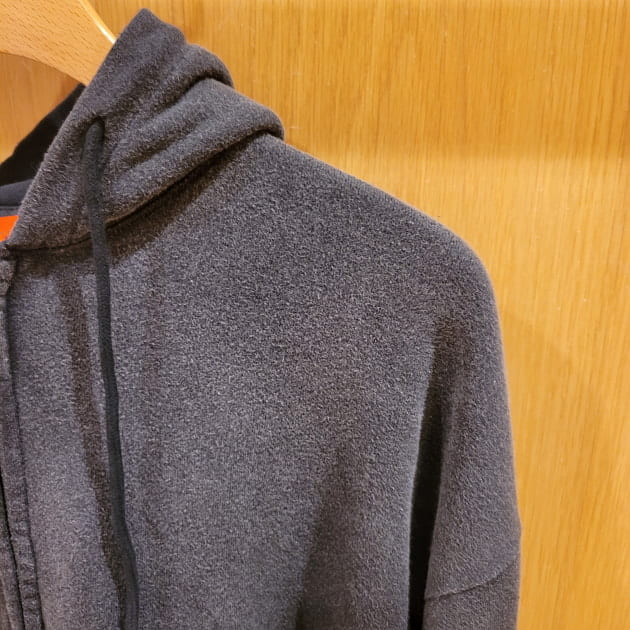 デザインはシンプルなジップパーカーですが、初めから毛羽立ちや色が抜けた様な雰囲気で、加工が好きな方にはまる1着だと思います。