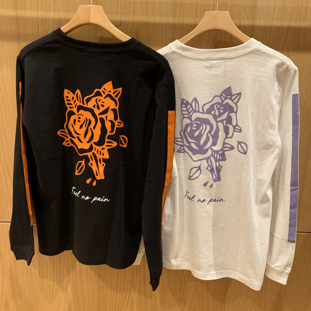 「FEEL NO PAIN」でバラのグラフィックとスリーブのプリントデザインもカラーリングを単色使いにしている為、意外にスタイリングし易いアイテムです。