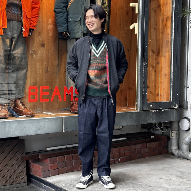 ダークトーンベースのスタイリングの中で、BARACUTAの裏地とニットの柄をアクセントに。気温が下がってきた事も考慮し、インナーにはタートルネックのカットソーをセレクト。