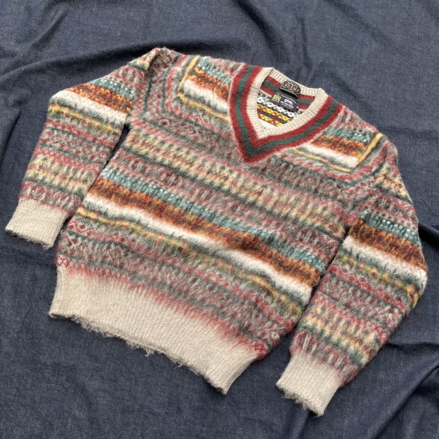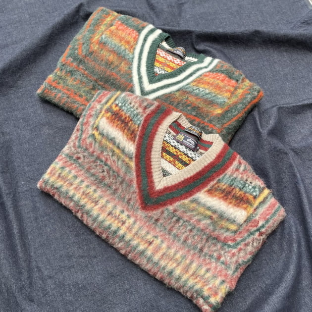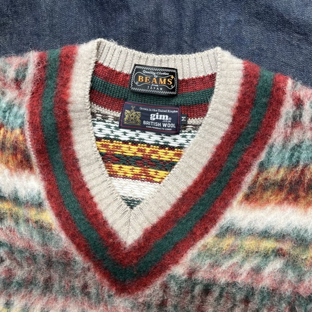 フェアアイル柄を起毛させているので、細かな柄を敢えてボヤけて見える様に表現しています。また、クリケットベストらしいVネックのラインは、くっきりと分かるようなメリハリがつけられており、両者の良い所が上手く組み合わさっているスペシャルなベストに。