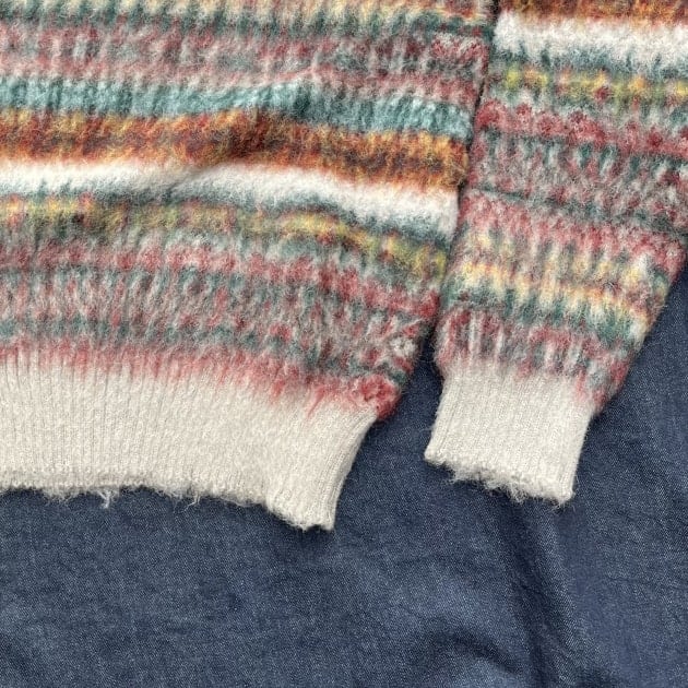 その名の通り、生地の表面が起毛している、所謂シャギーニット。起毛立たせることにより、空気の層が生まれ、保温性が高まるので見た目の印象通りすごく暖かい仕上がりとなっております。