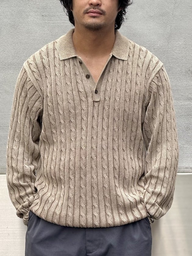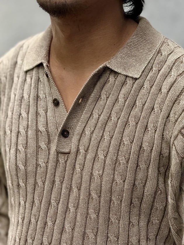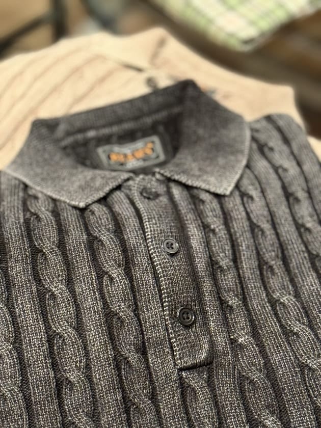 ピグメントダイで仕上げたケーブルニットポロです。