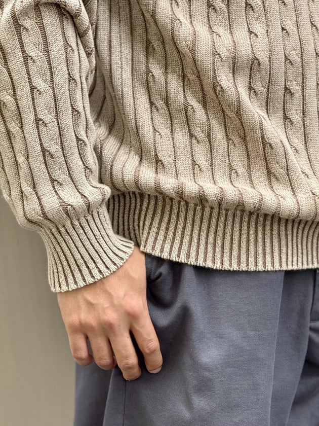 ケーブルニットは個人的にパキッとした色合いかつコンパクトなフィットティングイメージ。(あくまで主観です。)