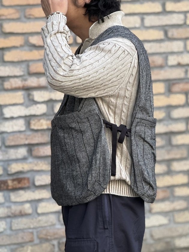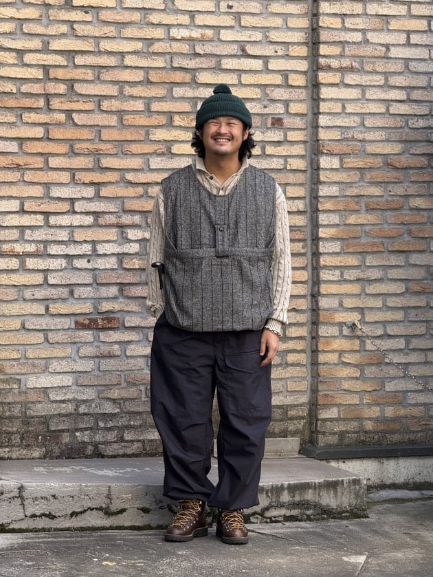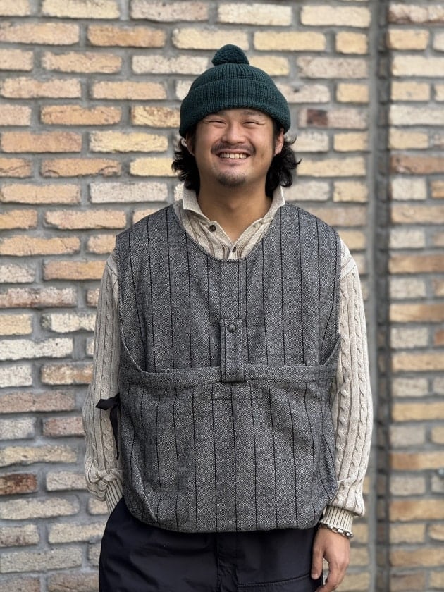 スタッフ有本にENGINEERED GARMENTSのNewsboyVestを着用してもらいました。